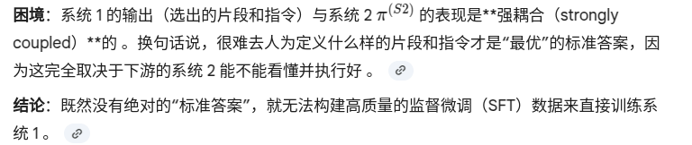 SFT的逻辑为 “给模型看大量‘输入→正确输出’的例子,让它学会模仿”,对于 System 1,输入是 “长视频 + 全局指令”,输出是 “关键段选择 + 局部指令”,这看起来就是一个典型的序列到序列(seq2seq)生成任务,完全符合 SFT 的应用范式