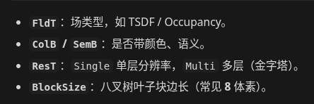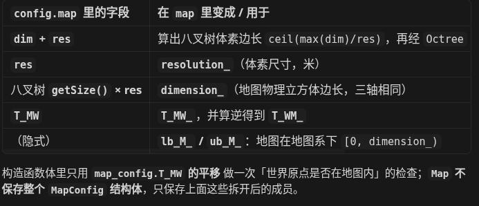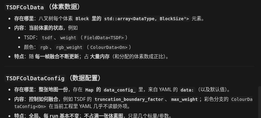 组成 map(Map 是 三维体素地图的入口:在固定 世界系(或地图系) 下的一块空间里,用 八叉树(Octree) 存每个体素里的 场数据(TSDF、占用等)以及可选的 颜色 / 语义。)
