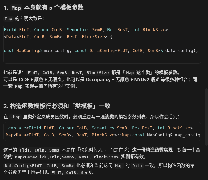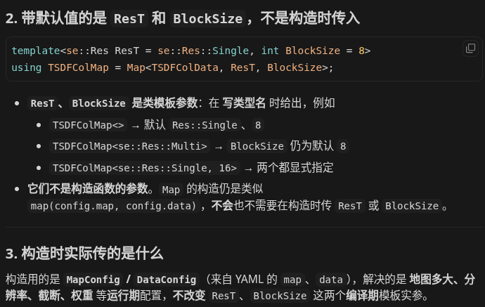 ResT和BlockSize有模板默认值;在实例化类型时可以不写(用默认),也可以显式写TSDFColMap<Res::Multi, 16>这类。构造时只传