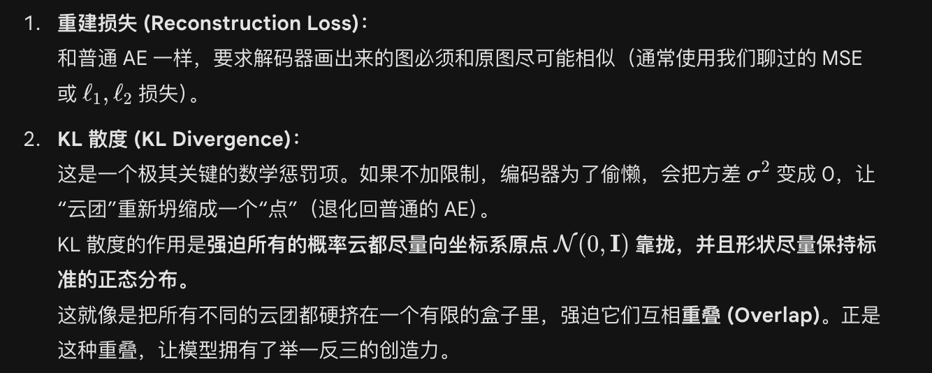 普通的 AutoEncoder是一个两头大、中间小的沙漏型神经网络;但他的隐空间是离散的、不连续的,如果你强行在隐空间里随机生成一个点丢给解码器,它大概率会输出一团乱码。